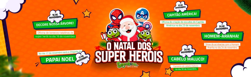 O Engenhoca Parque está mais preparado do que nunca para dar início à temporada natalina! O natal começou cedo por aqui e já em novembro, teremos uma programação especial repleta de aventuras com nossos heróis favoritos, oficinas criativas e, claro, a tão esperada chegada do Papai Noel! Não perca nenhuma das atrações que farão desta época um momento inesquecível para toda a família:
